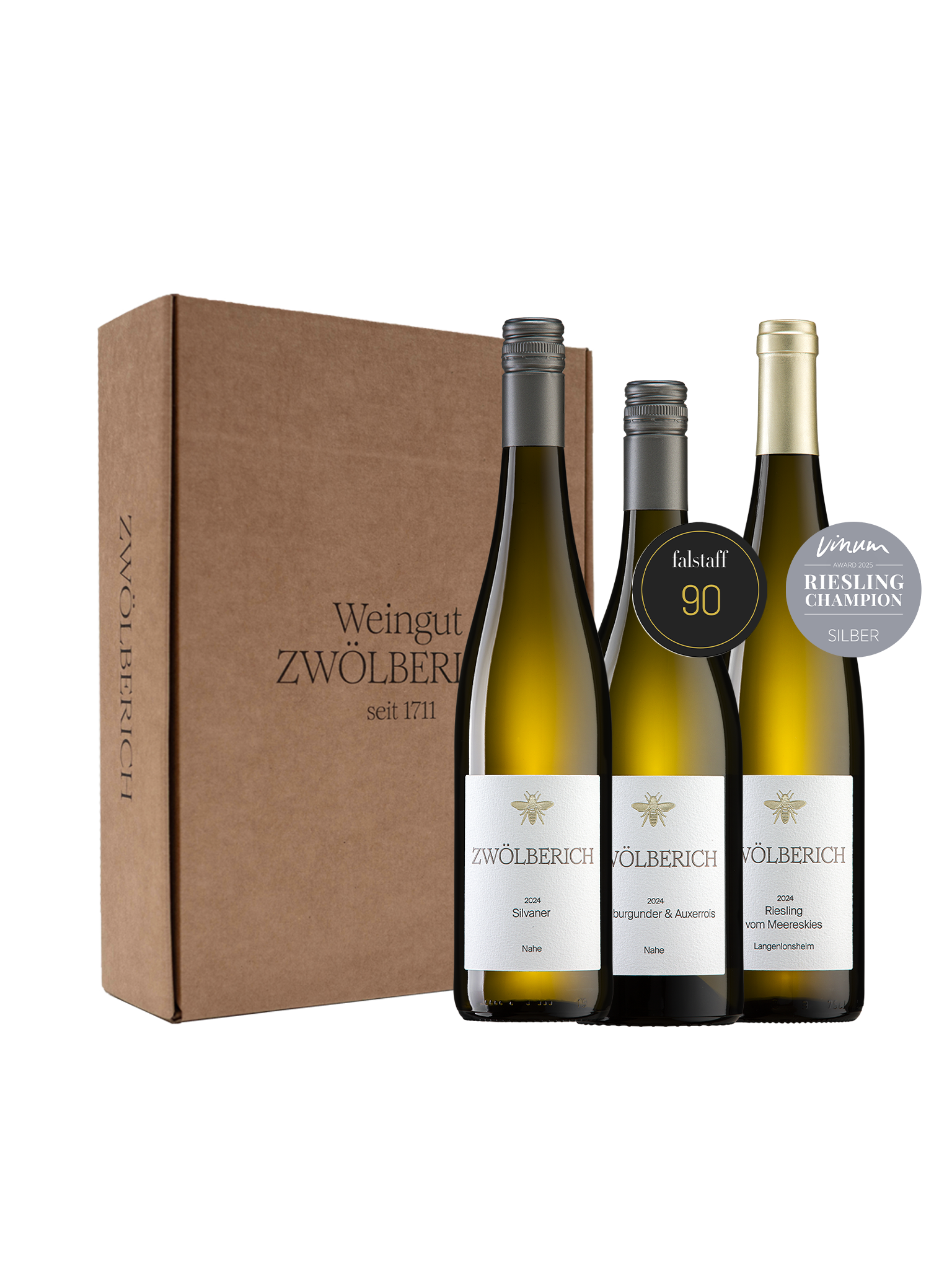 Dieses Präsent vereint zwei charaktervolle Gutsweine und einen ausdrucksstarken Ortswein aus dem 2024er Jahrgang, allesamt von Vinum und Falstaff prämiert und im eleganten, nachhaltigen 3er-Präsentkarton. Der Silvaner zeigt sich würzig, dicht und aromatisch tief, mit dezenter Barriquenote, frischer Kräuteraromatik und ausgewogener Säure. Die Cuvée aus Grauburgunder und Auxerrois besticht durch cremige Fülle, reife gelbe Frucht, feinen Schmelz und eine harmonische Struktur. Ergänzt wird das Set durch den Langenlonsheimer Riesling vom Meereskies, geprägt von Zitrus, grünem Apfel, lebendiger Mineralität und zarter Cremigkeit. Ein stilvolles Geschenk, das die Vielfalt des Hauses perfekt widerspiegelt.